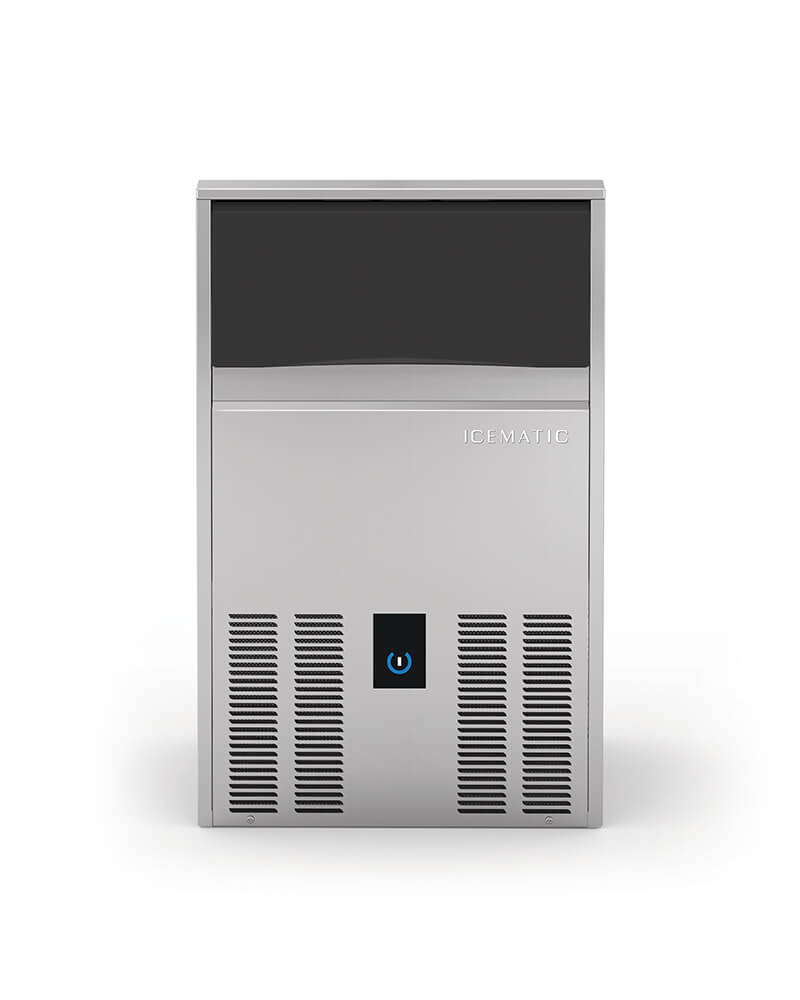 Icematic Cherry – Full og transparent isbits med avrundede overflater. Elegant og effektiv for isbøtter, cocktails, aperitiff og whisky on the rocks. Kapasitiv touch-betjening, innebygd beholder i rustfritt stål.